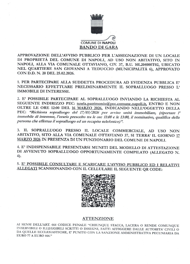 Avviso Pubblico per l'assegnazione in locazione di un locale di proprietà del Comune di Napoli, ad uso non abitativo, sito in Napoli, a Via Comunale Ottaviano, civ. 37, B.U. 10L204000T02, quartiere San Giovanni a Teduccio (Municipalità 6).