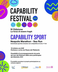 Le giornate del Capability Festival saranno arricchite da aperitivi preparati e serviti da enti che lavorano con persone con disabilità (Argo, A Ruota libera, La bottega dei semplici pensieri) e si chiuderanno con performance artistiche di altissimo valore culturale e inclusivo. Al Maschio Angioino, dal 15 al 17, ogni pomeriggio sono previste, inoltre, per la sezione Capability Kids, attività ludico e laboratoriali per i bambini curate dalla Ludoteca CittadiNA del Servizio Politiche per l'Infanzia e l'Adolescenza e Sostegno alla Genitorialità del Comune di Napoli – Assessorato alle Politiche Sociali.
