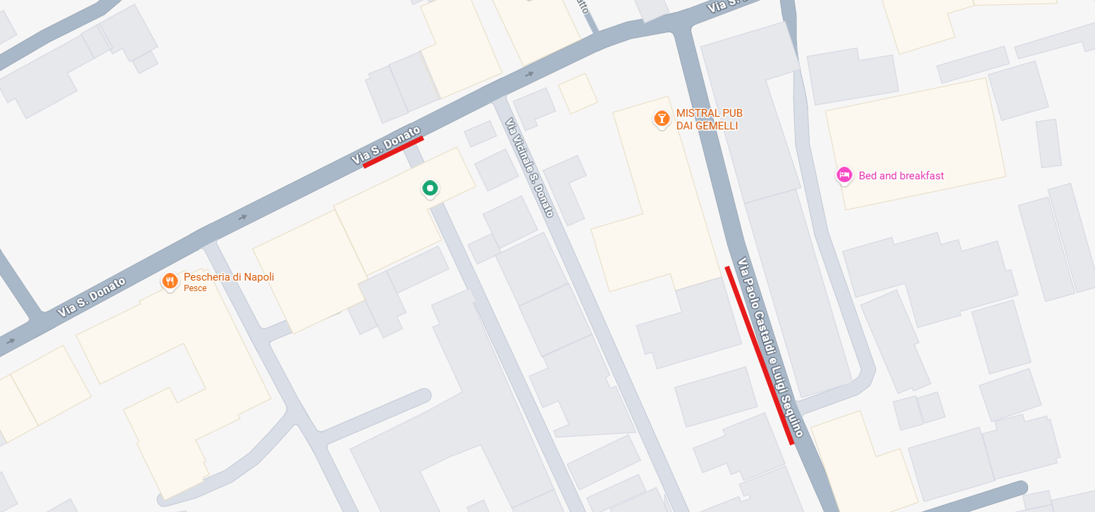 È istituito, dal 15 al 24 aprile 2026 o fino a cessate esigenze, dalle ore 9:00 alle ore 17:00 (solo nelle giornate interessate dalle lavorazioni), il divieto di transito dei veicoli aventi massa complessiva a pieno carico superiore a 3,5 tonnellate in via San Donato e via Paolo Castaldi e Luigi Sequino, per lavori di scavo da parte di e distribuzione S.p.A.