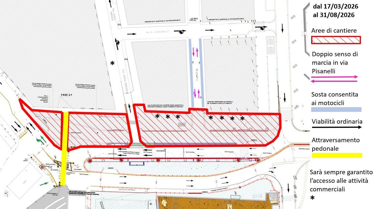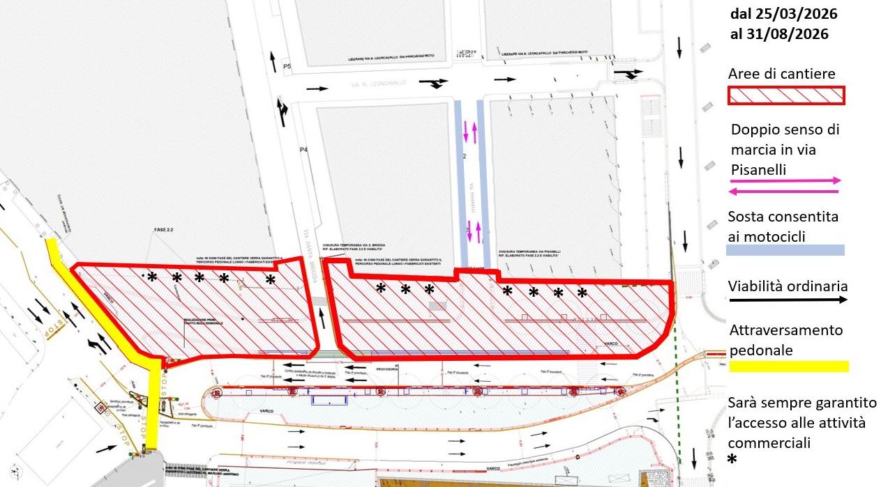 E) Sospensione, in Via Pisanelli - sul lato destro in direzione via Vittorio Emanuele III, nel tratto compreso tra la confluenza con Via Leoncavallo e la confluenza con Via Vittorio Emanuele III - dell’area riservata alla sosta a pagamento senza custodia (cosiddette “strisce blu”), consentita nella fascia oraria 20:00-24:00 nei giorni feriali e nella fascia oraria 8:00-24:00 nei giorni festivi.
