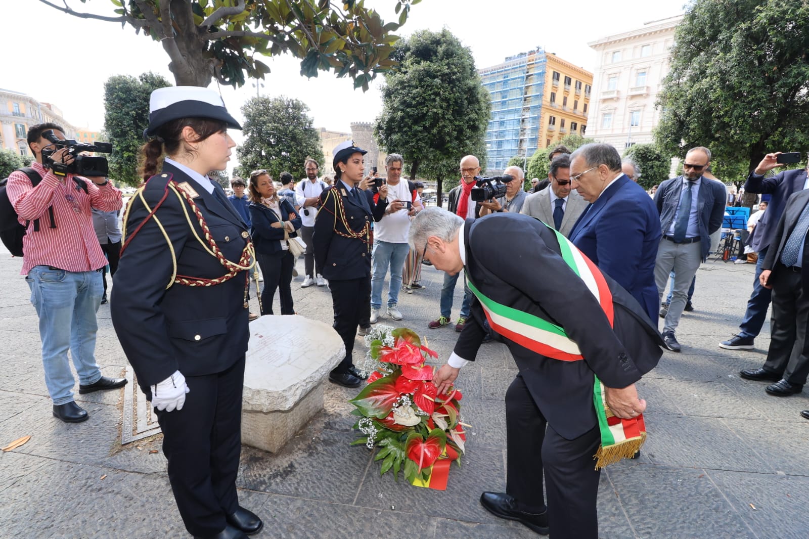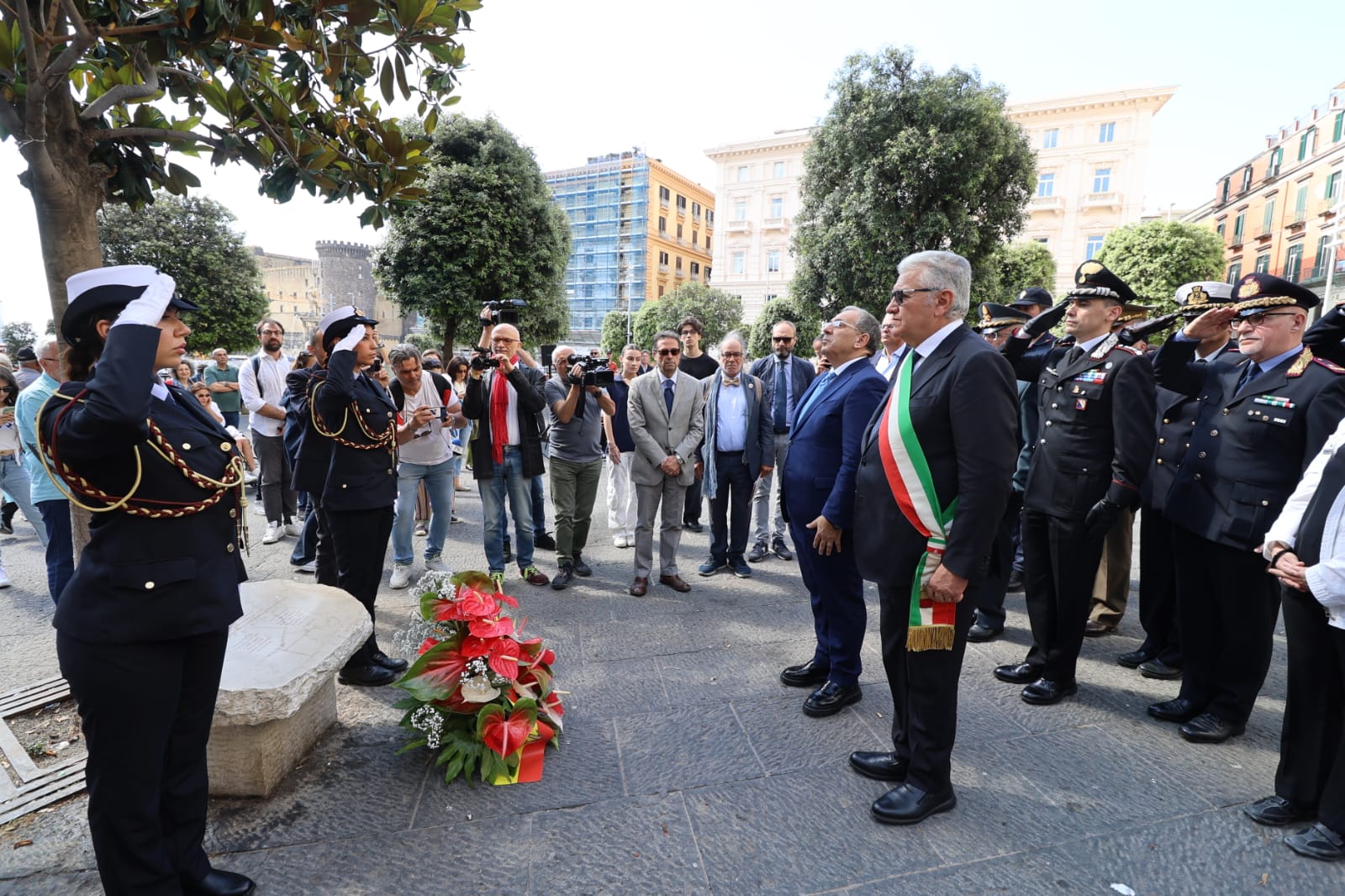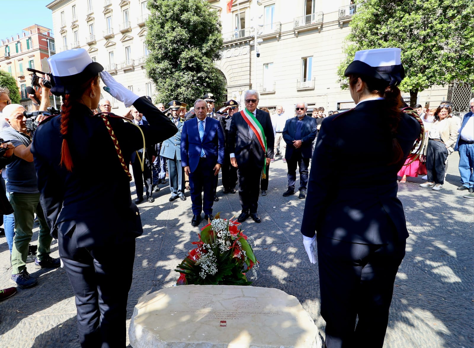 Nel 32esimo anniversario della strage di Capaci, l’assessore alla Sicurezza e alla Legalità del Comune di Napoli e il prefetto di Napoli Michele di Bari hanno deposto dei fiori davanti alla lapide in piazza Municipio che ricorda il sacrificio dei magistrati Giovanni Falcone e Paolo Borsellino e delle donne e uomini delle loro scorte.