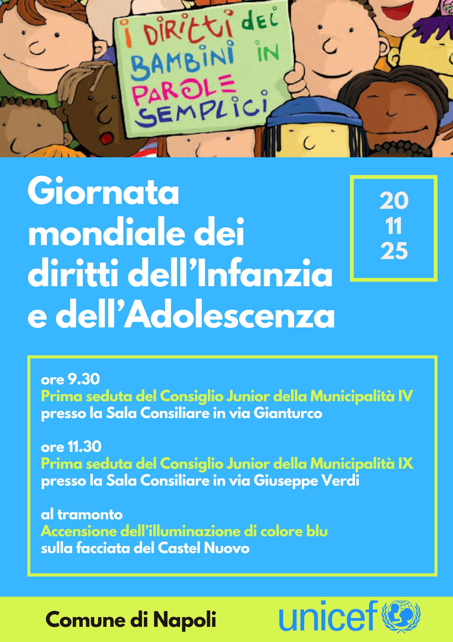 A coronare la giornata, al tramonto, il Castel Nuovo si illuminerà di blu , simbolo del sostegno di Napoli ai diritti dell’infanzia e della vicinanza della città ai valori promossi da UNICEF.