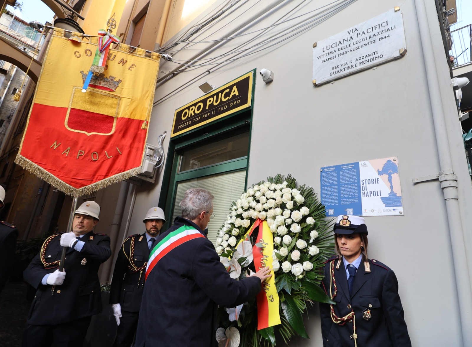 Il ricordo della tragedia della Shoah rivive nei luoghi di Napoli legati alle persecuzioni naziste. Questa mattina, in occasione del Giorno della Memoria, il sindaco Gaetano Manfredi, alla presenza del prefetto Michele di Bari e delle autorità civili e militari, ha deposto una corona di fiori nella strada di Borgo Orefici intitolata a Luciana Pacifici, la bimba nata a Napoli da una famiglia di ebrei toscani. La piccola Luciana, catturata insieme ai genitori e ad altri familiari, trascorse gran parte della sua breve vita in un campo di concentramento a Bagni di Lucca. Non aveva neppure otto mesi quando perse la vita su un convoglio diretto ad Auschwitz.