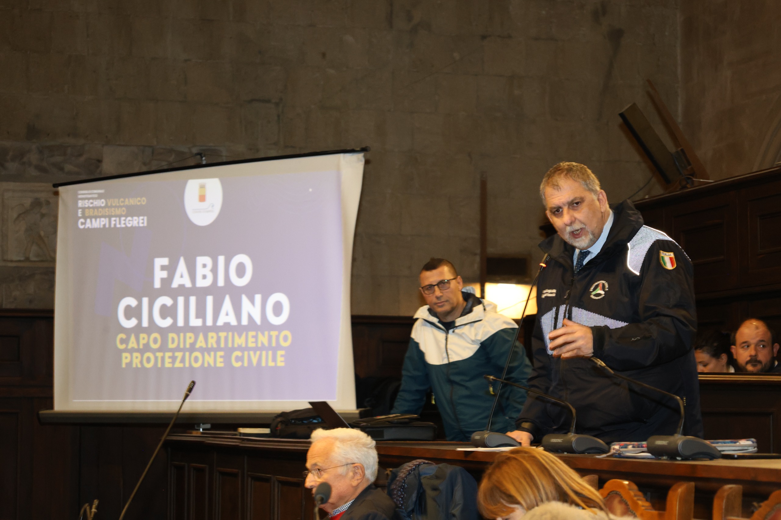 Dopo l’informativa del sindaco Gaetano Manfredi sulla situazione in corso, il consiglio comunale straordinario sul rischio bradisismico è proseguito con Fabio Ciciliano, capo del Dipartimento di Protezione Civile, che ha sottolineato l'importanza della sinergia istituzionale nella gestione del rischio bradisismico, oggetto di una valutazione e di una serie di misure di protezione civile che si protraggono sin dal 2001 e si sono intensificate dal mese di settembre 2023, quando il fenomeno bradisismico è ripreso con una certa intensità nell’area che comprende Pozzuoli, Bacoli e i quartieri napoletani di Bagnoli e Agnano.