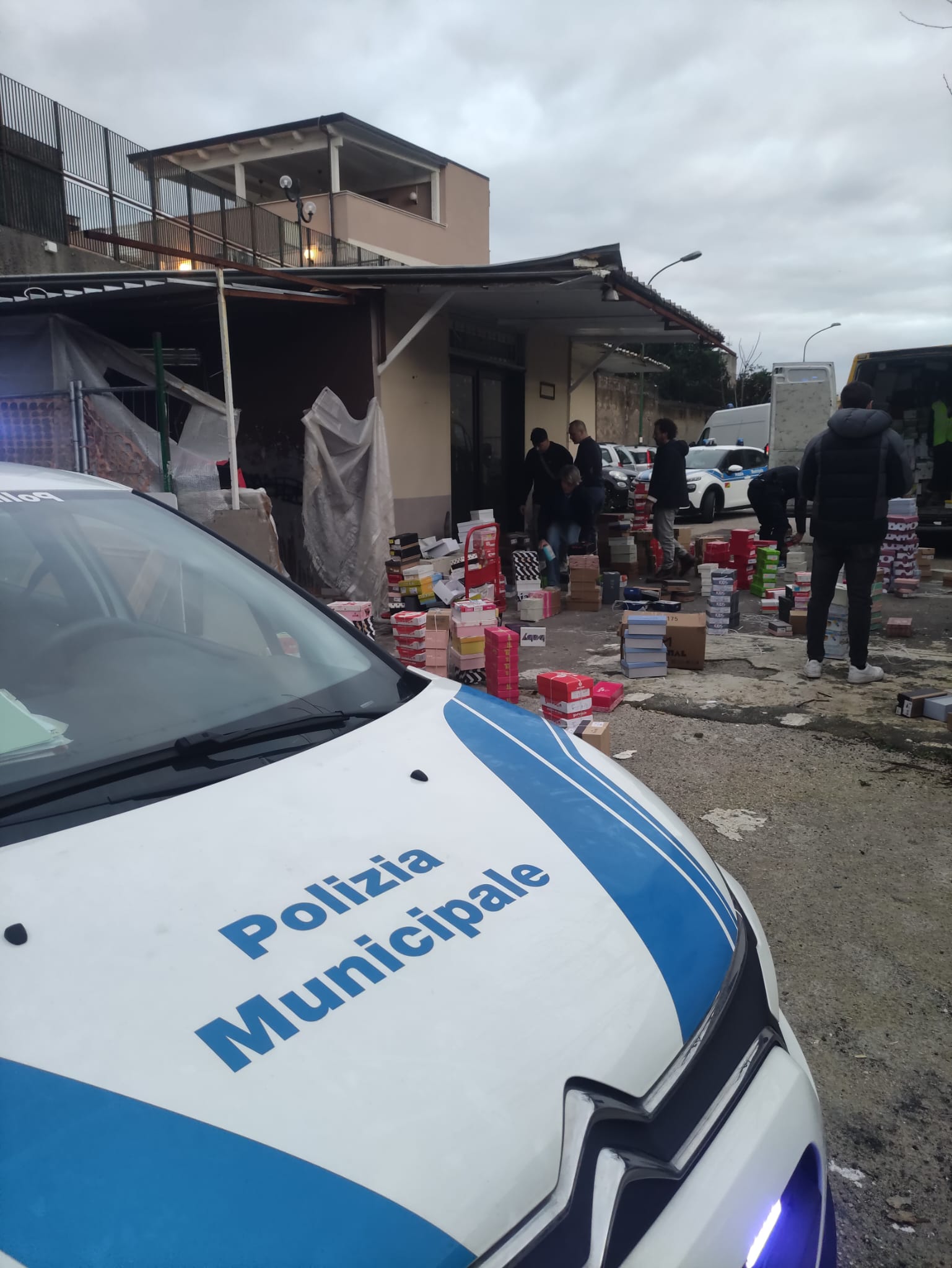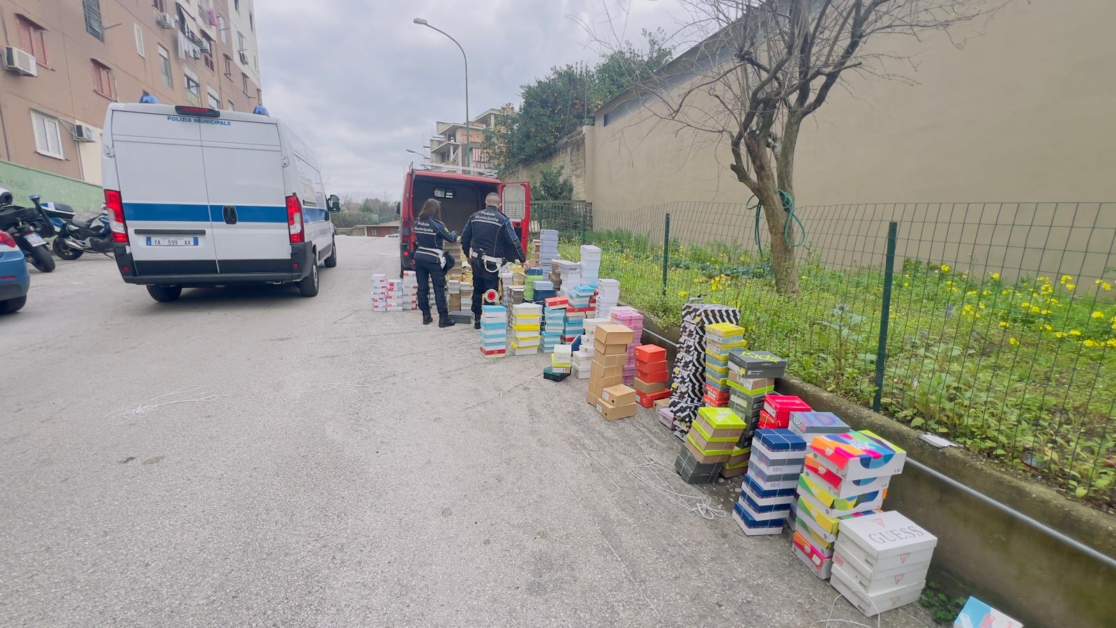 Ulteriori accertamenti di natura edilizia effettuati nella stessa zona hanno permesso di individuare un manufatto abusivo realizzato su area pubblica, per il quale è stato disposto il sequestro. All’interno erano stoccate duemila paia di calzature della stessa tipologia di quelle rinvenute nel furgone. La merce è stata sequestrata e affidata a un custode giudiziario. Per questo episodio si procede per il reato di ricettazione.