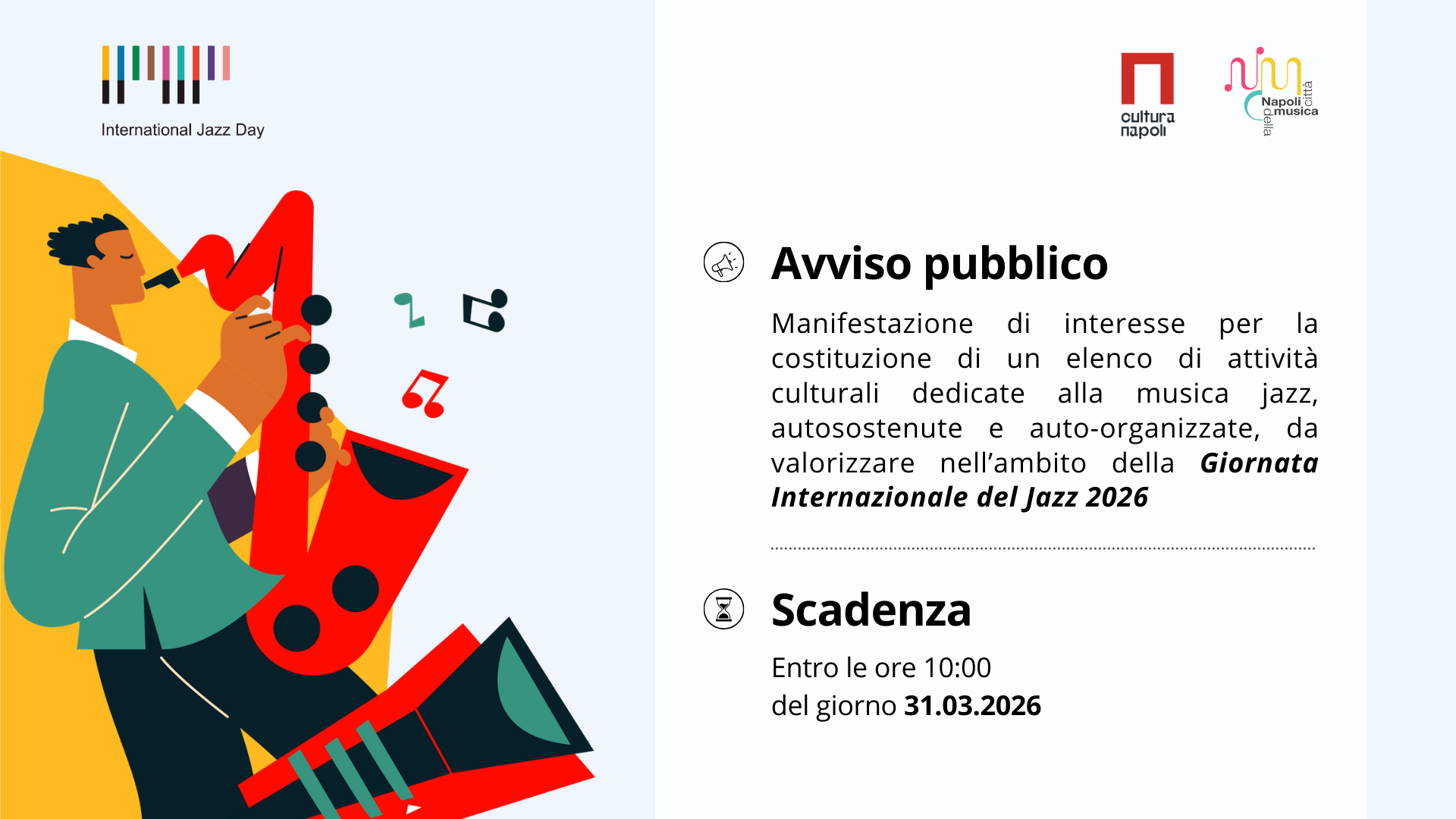 Con il presente Avviso, il Comune di Napoli intende dare visibilità e risalto alle attività culturali dedicate alla musica Jazz, nell’ambito della Giornata internazionale del Jazz, da svolgersi nel periodo compreso tra il 24 aprile ed il 4 maggio 2026.