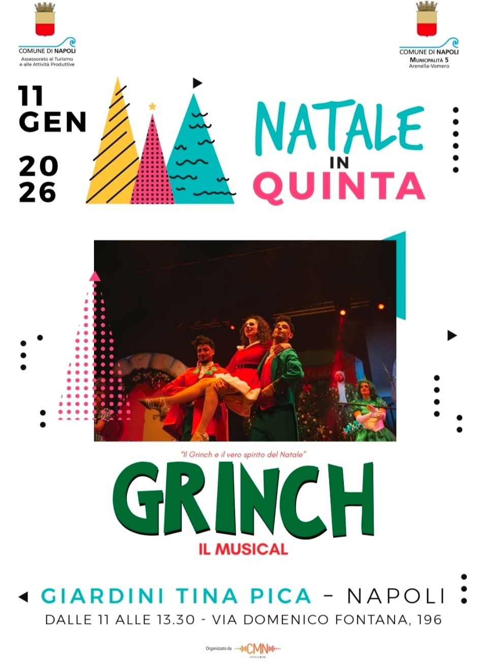 Si comunica che l'evento "Grinch - Il musical", chiusura della manifestazione Natale in Quinta, avrà luogo il prossimo 11 gennaio 2026 dalle ore 11:00 alle ore 13:30 presso i Giardini Tina Pica in Via Domenico Fontana n. 196 - Napoli.