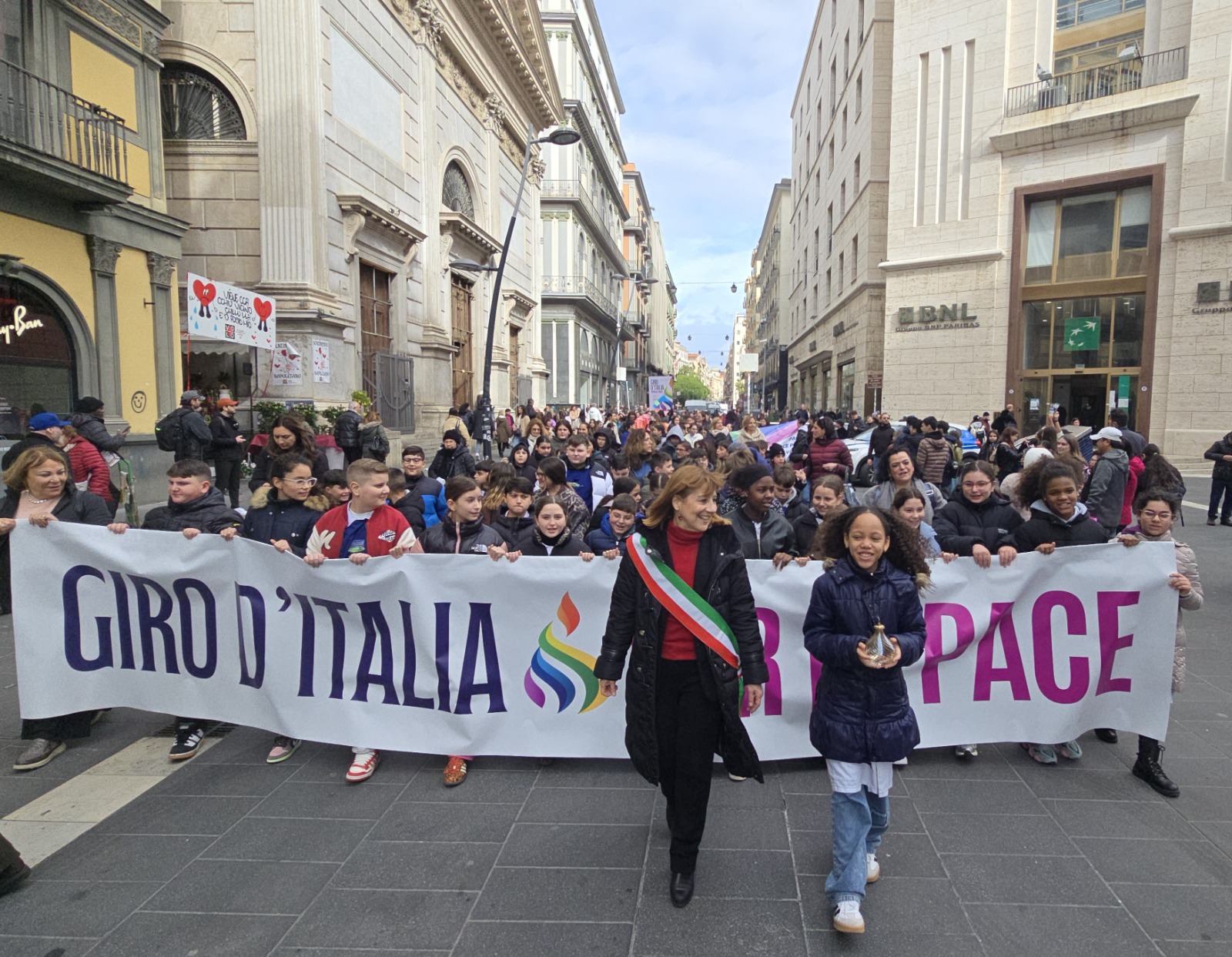 Studentesse e studenti delle scuole cittadine, insieme a rappresentanti delle istituzioni e del mondo delle associazioni, hanno animato oggi la prima tappa del Giro d’Italia per la Pace . L’iniziativa, promossa dal Coordinamento Nazionale degli Enti Locali per la Pace e i Diritti Umani, ha l’obiettivo di stimolare una coscienza, una cultura e una politica di pace e di cura degli altri, partendo dalle giovani generazioni. Quest’anno, il Giro coincide con l’ottavo centenario del Transito del Patrono d’Italia, San Francesco d’Assisi, e con gli 80 anni dalla nascita della Repubblica Italiana. Il percorso ha preso il via da Napoli con una serie di appuntamenti organizzati dal Comune – Assessorato all’Istruzione e alle Famiglie .