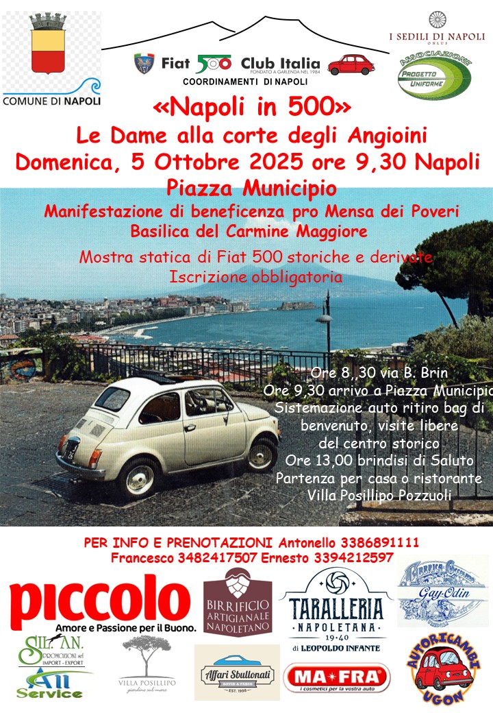 Per il 4° anno si svolge a Napoli, domenica 5 ottobre con il consueto mood “Napoli in 500”, per trasmettere la particolare emozione di girare la città nelle piccole vetturette, il raduno delle Fiat 500 storiche organizzato dai coordinamenti della Città del Fiat 500 Club Italia con le associazioni culturali “i sedili di Napoli” e “ Progetto uniforme” per creare un evento che abbia innanzitutto una funzione sociale in quanto si opererà una raccolta fondi a favore della Mensa dei Poveri della Basilica del Carmine Maggiore.
