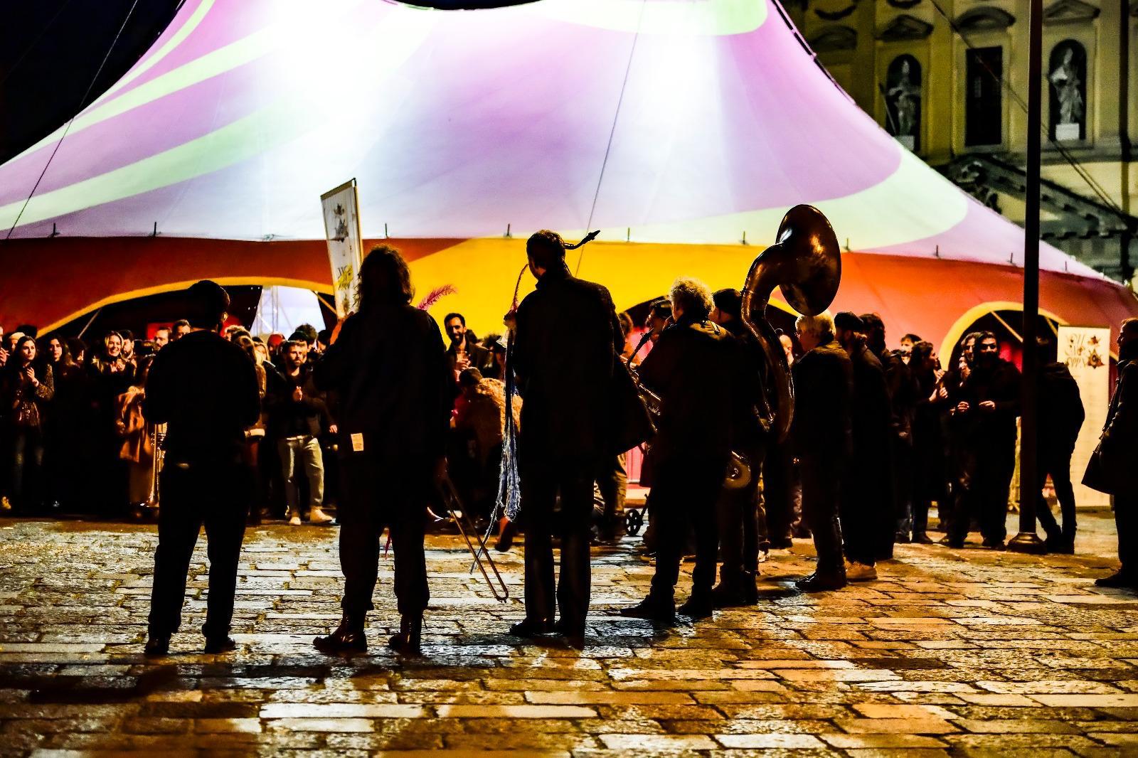 Nel grande tendone da circo allestito in Piazza Mercato e nelle chiese che lo circondano, zampogne, tromboni, archi, strumenti antichi e inventati, ciaramelle e pivette, percussioni e strumenti orientali daranno vita a uno spazio farsesco e immaginifico in cui il grandioso e il meschino, il sacro e il profano, la nascita e la morte convivono concretamente.
