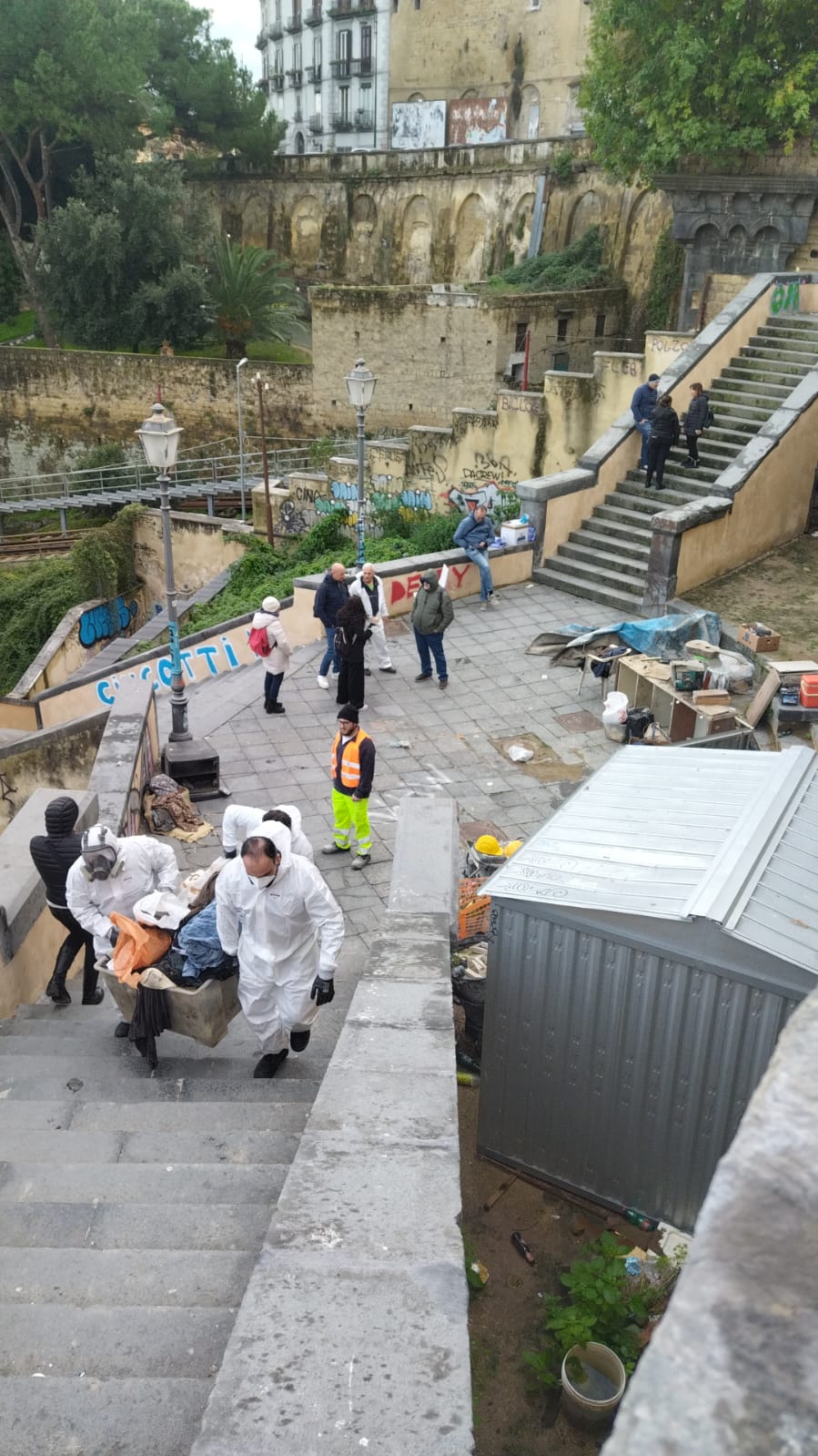 L’intervento si è reso necessario per far proseguire i lavori di rigenerazione e riqualificazione urbana delle scale di Montesanto, uno dei sei lotti del progetto "Città Verticale: riqualificazione dei percorsi pedonali tra le colline e il mare", coordinato dal Servizio Progetti e Gestione Grandi Parchi Urbani del Comune di Napoli.