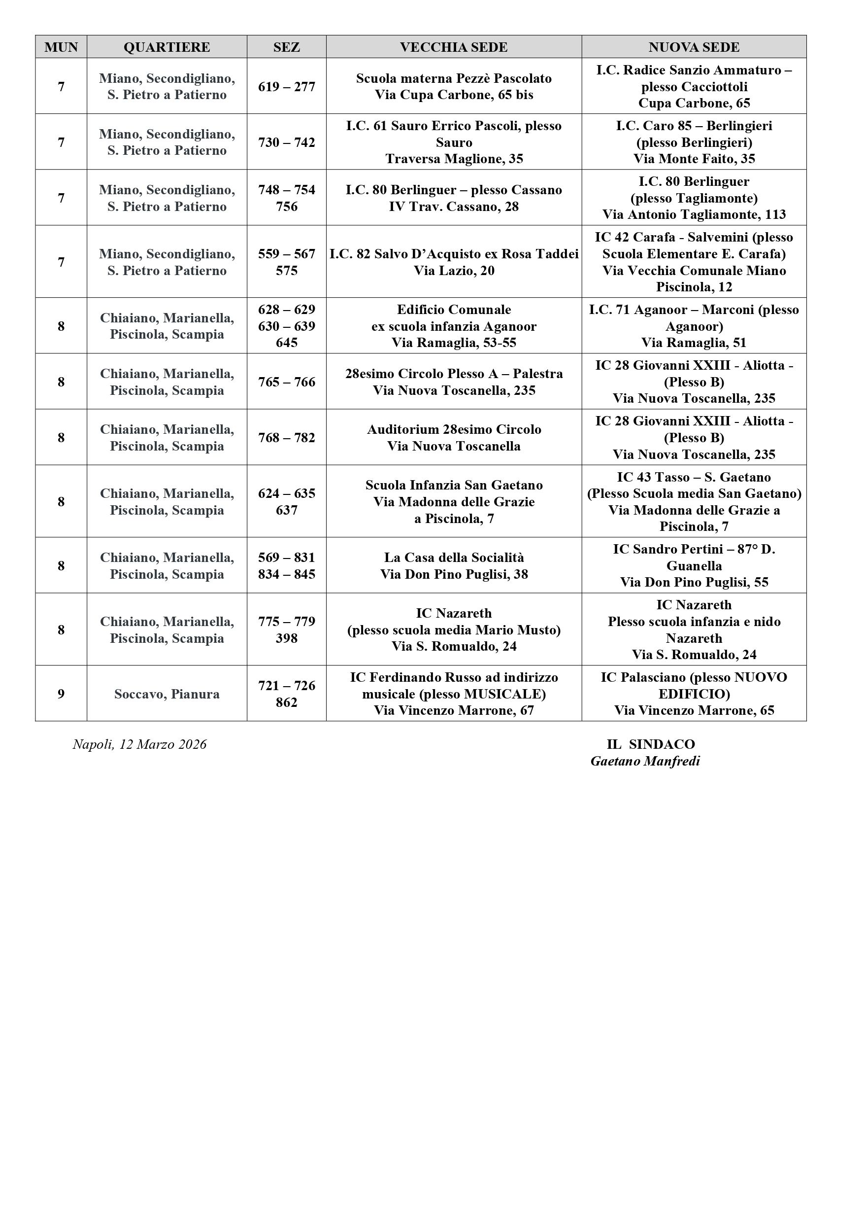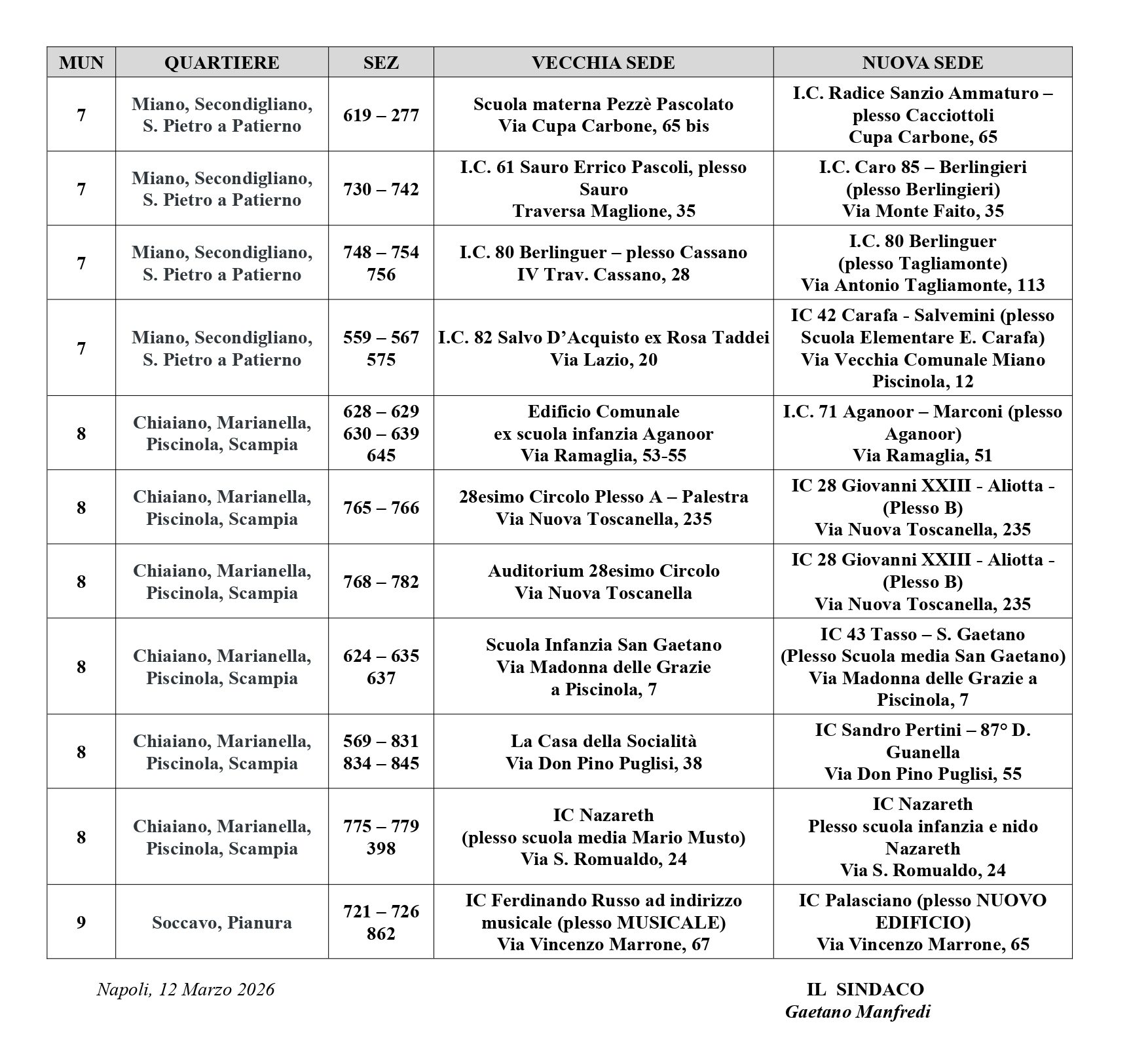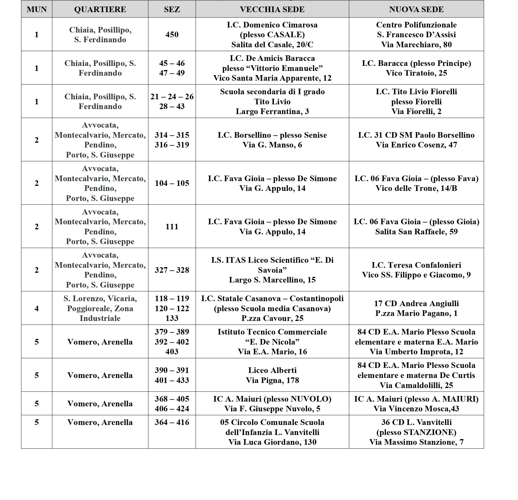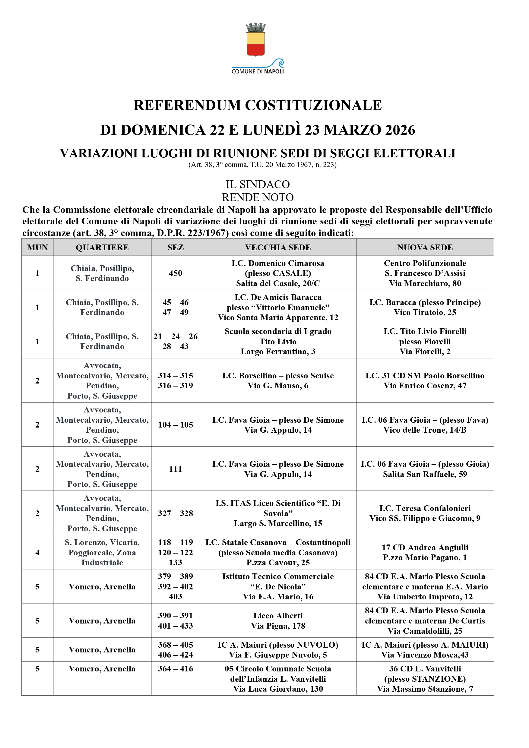 che la Commissione elettorale circondariale di Napoli ha approvato le proposte del Responsabile dell’Ufficio elettorale del Comune di Napoli di variazione dei luoghi di riunione sedi di seggi elettorali per sopravvenute circostanze (art. 38, 3° comma, D.P.R. 223/1967) così come di seguito indicati: