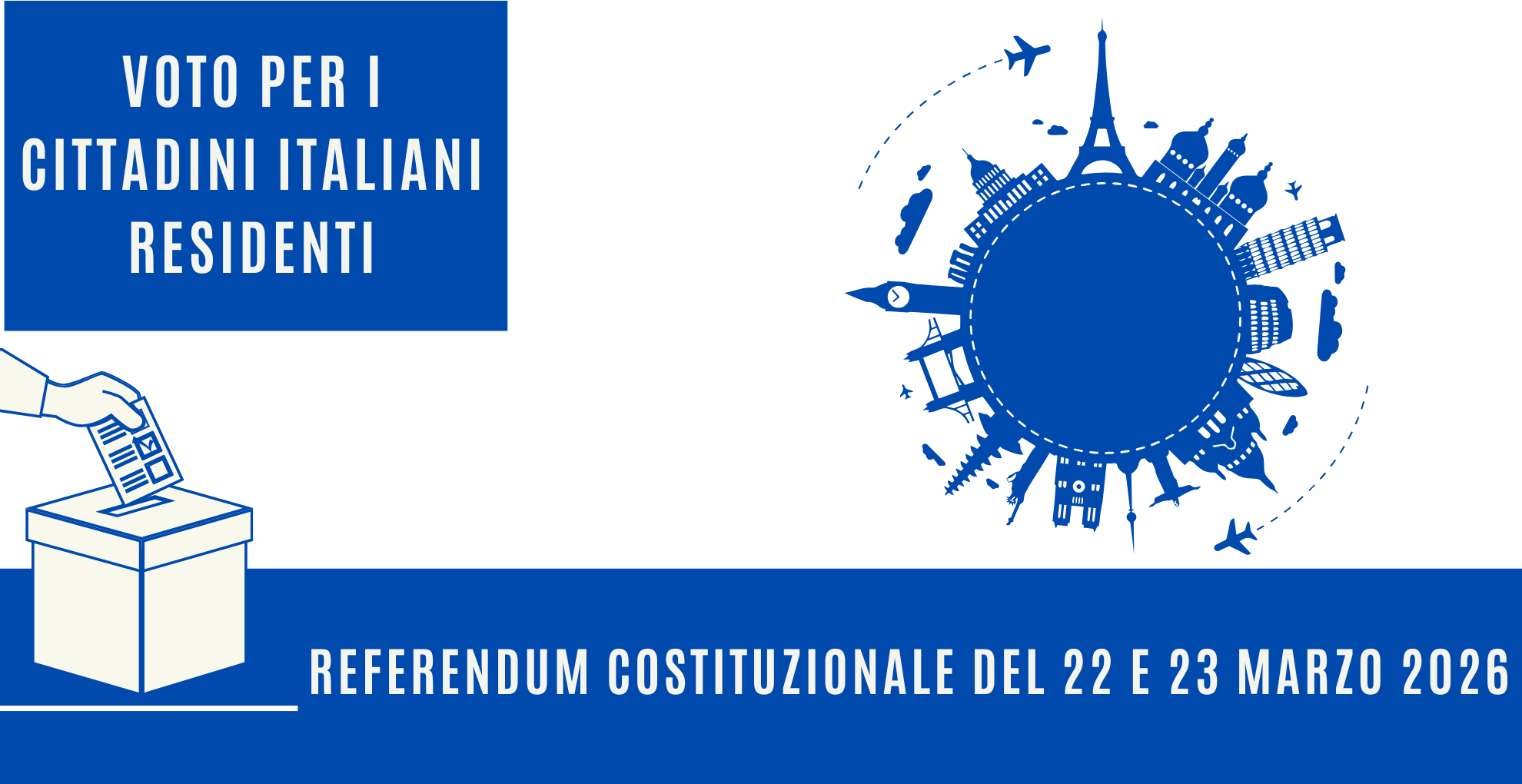 Si ricorda che il voto è un diritto tutelato dalla Costituzione Italiana e che, in base alla Legge 27 dicembre 2001, n. 459, i cittadini italiani residenti all’estero, iscritti nelle liste elettorali, possono votare per posta, ricevendo il plico elettorale al proprio indirizzo di residenza.