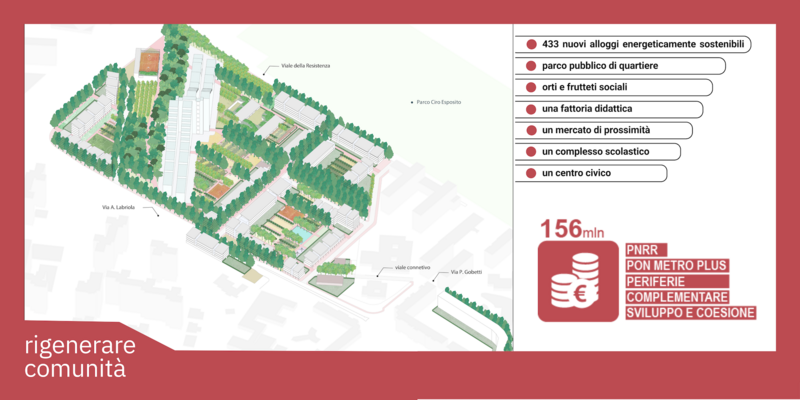 Oltre alla componente fisica, il progetto include un forte impegno nell’accompagnare le trasformazioni fisiche con delle attività sociali e di partecipazione. Saranno offerti servizi di quartiere e spazi di confronto attraverso il processo di co-progettazione con tutte le realtà del territorio, le associazioni, gli enti istituzionali, i comitati e le varie forme in cui gli abitanti si organizzano. Questo accompagnerà la comunità nel processo di riqualificazione, promuovendo la partecipazione attiva degli abitanti.