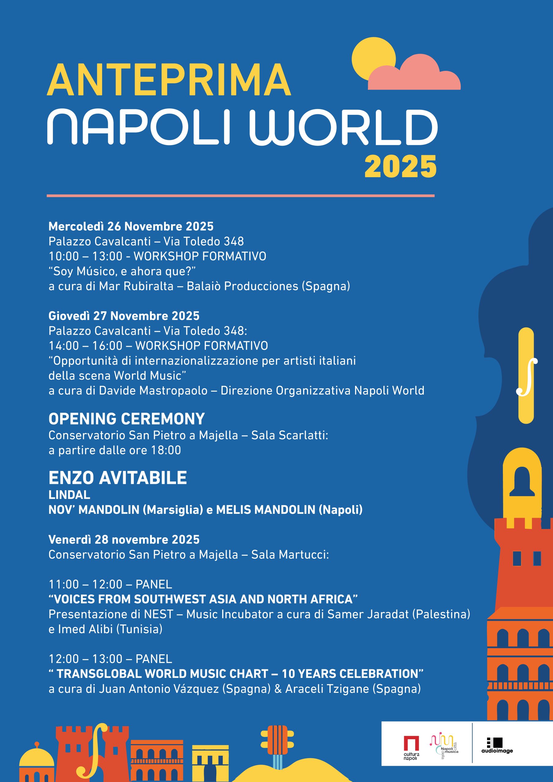 L’anteprima di “Napoli World” – organizzata dalla società Audioimage e promossa e finanziata dal Comune di Napoli nell’ambito del progetto “Napoli Città della Musica” – è accompagnata da tre esclusivi incontri professionalizzanti, che si svolgeranno tra la Casa della Cultura di Palazzo Cavalcanti, in via Toledo 348, e il Conservatorio San Pietro a Majella in Via San Pietro a Majella 35.