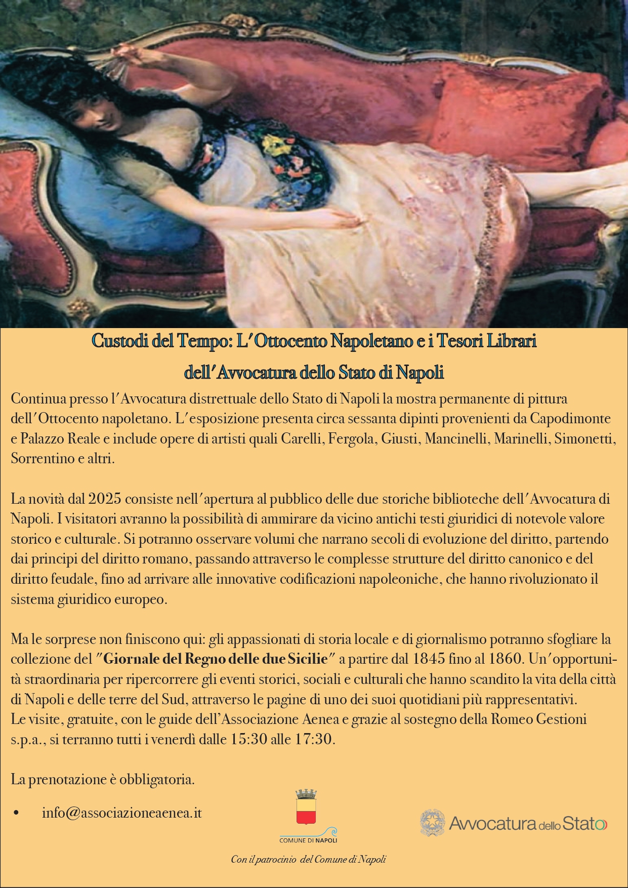 L'Avvocatura distrettuale dello Stato di Napoli, con il patrocinio del Comune di Napoli, prosegue la sua mostra permanente di pittura dell'Ottocento napoletano presso la sua sede in via Armando Diaz n. 11, Napoli. L'esposizione presenta circa sessanta dipinti provenienti da Capodimonte e Palazzo Reale e include opere di artisti quali Carelli, Fergola, Giusti, Mancinelli, Marinelli, Simonetti, Sorrentino e altri.