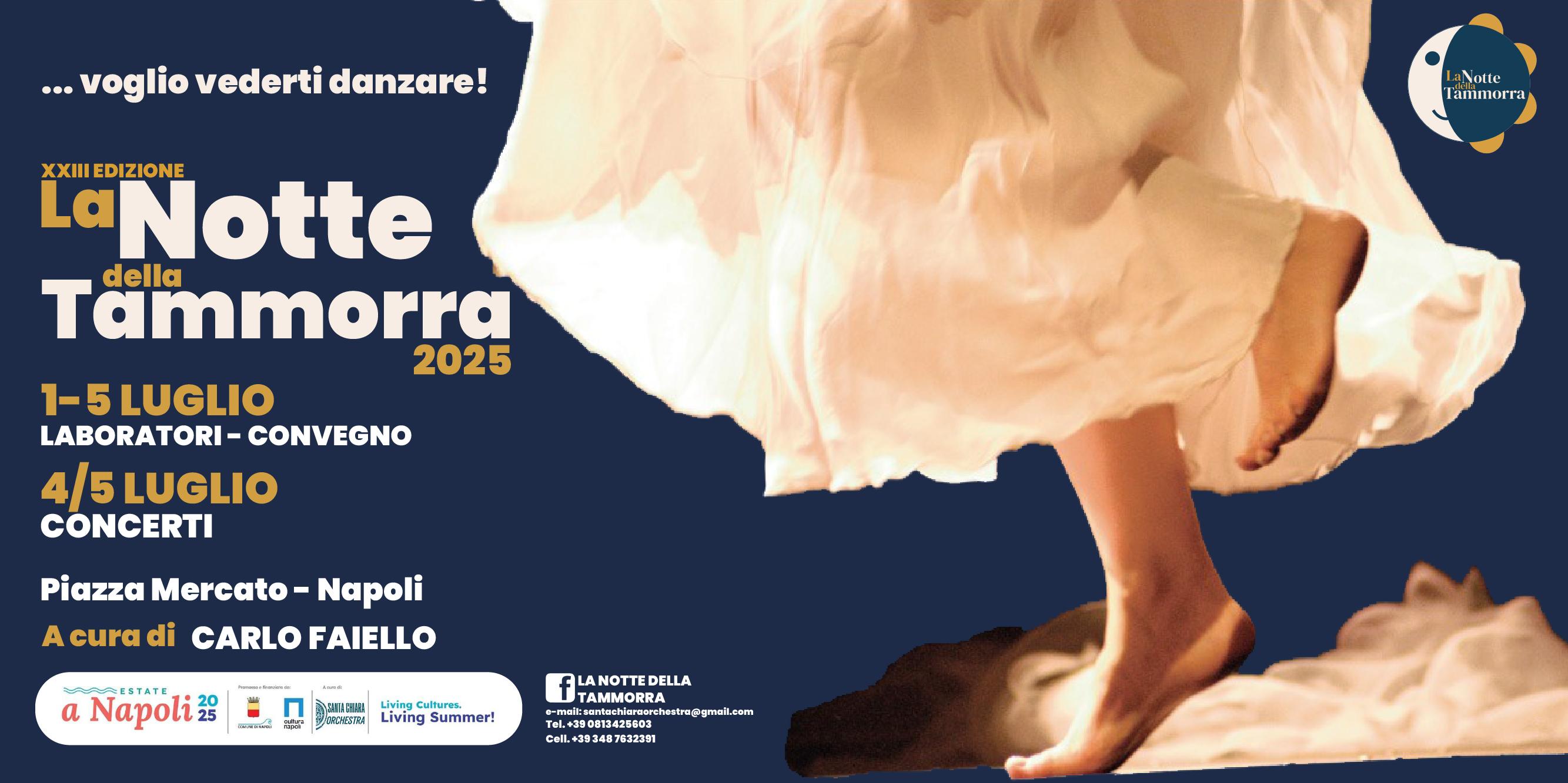 Sulla scorta del successo dello scorso anno, con una presenza di oltre 30.000 persone, torna dal 1°al 5 luglio 2025, nella suggestiva cornice di Piazza Mercato, la XXIII edizione de “La Notte della Tammorra”.