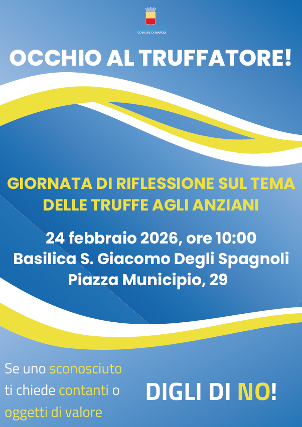 Martedì 24 febbraio, alle ore 10:00, presso la Basilica di San Giacomo degli Spagnoli in Piazza Municipio si svolgerà l’evento conclusivo del progetto “Occhio al Truffatore”, campagna di sensibilizzazione per prevenire e contrastare il fenomeno delle truffe agli anziani promossa dal Comune di Napoli e finanziata tramite il Fondo per la prevenzione ed il contrasto delle truffe agli anziani del Ministero dell’Interno.