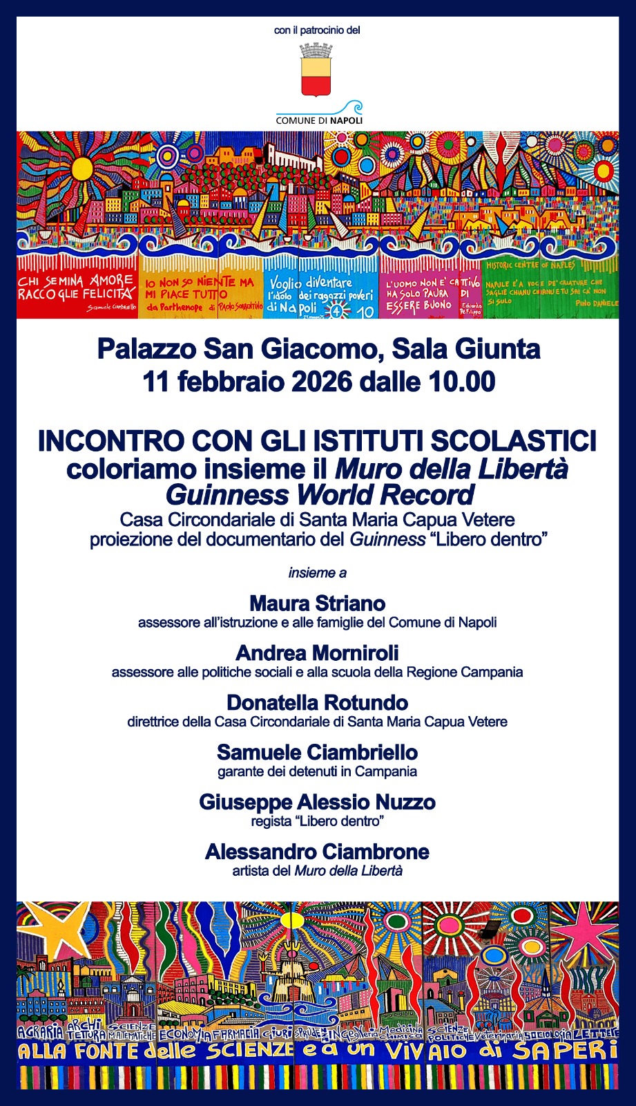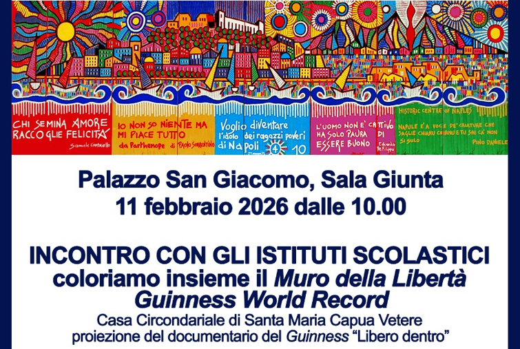 Mercoledì 11 febbraio, alle ore 10:00, presso Palazzo San Giacomo – Sala Giunta, si terrà l’incontro di presentazione del progetto “Muro della libertà”, ideato dall’artista Alessandro Ciambrone, che sarà presente all’evento. Nel corso dell’incontro sarà proiettata una parte del documentario dedicato al progetto: il murale, realizzato lungo il muro di cinta della Casa Circondariale di Santa Maria Capua Vetere e riconosciuto dal Guinness World Record come il più esteso al mondo, viene oggi trasformato in un’opera d’arte collettiva attraverso la partecipazione attiva delle scuole. L’incontro è finalizzato a favorire l’adesione delle scuole della città di Napoli a questo percorso educativo e culturale.