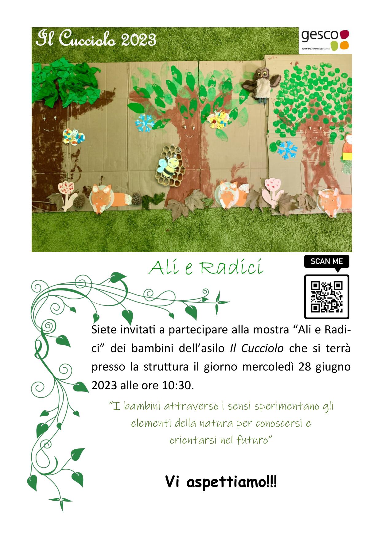 Siete invitati a partecipare alla mostra “Ali e Radici” dei bambini dell’Asilo Il Cucciolo che si terrà presso la struttura il giorno mercoledì 28 giugno 2023 alle ore 10:30.